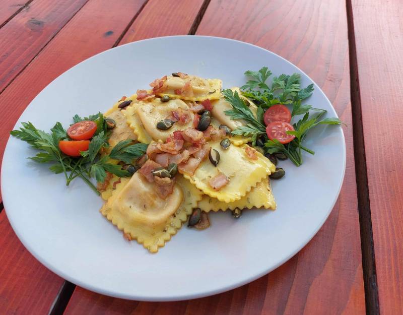 1 adag Sütőtök krémmel töltött tortellini rozmaringos baconos vajban és pirított tökmaggal