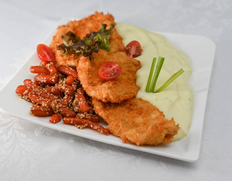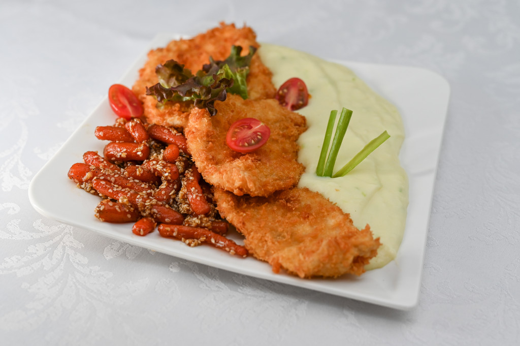 Panko morzsában sült csirkemell, szezámmagos mézes sült bébi répával, snidlinges burgonya pürével