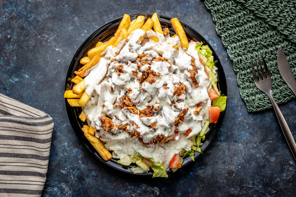 Friss saláta, Gyros hús, Gyros öntet, Hasábburgonya, Paradicsom, Uborka