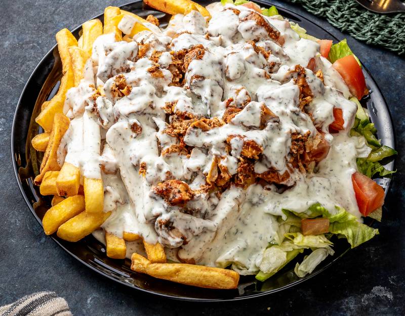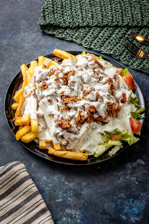 Chili szósz, Friss saláta, Gyros hús, Gyros öntet, Hasábburgonya, Paradicsom, Uborka