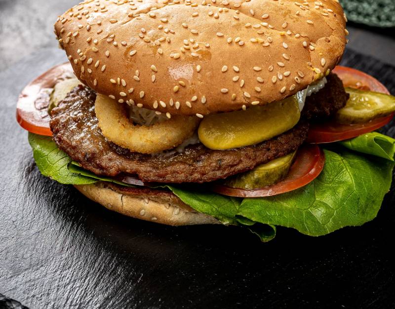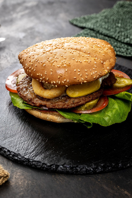 Csemege uborka, Extra marhahús pog, Hagymakarika, Hagymakarika, Ketchup, Majonéz, Mustár, Paradicsom, Saláta