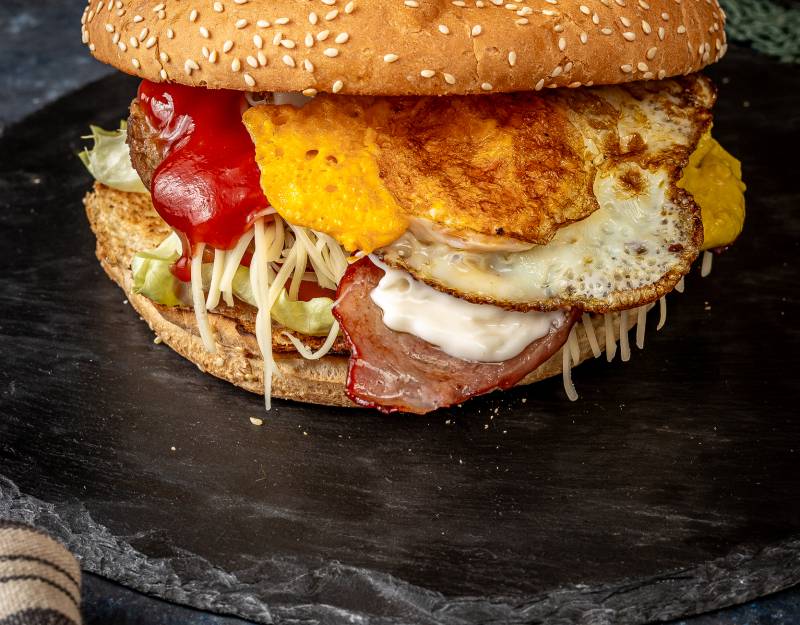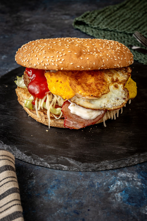 Extra marhahús pog, Grillezett Tarja, Ketchup, Majonéz, Mustár, Paradicsom, Sajt, Saláta, Tükörtojás, Uborka