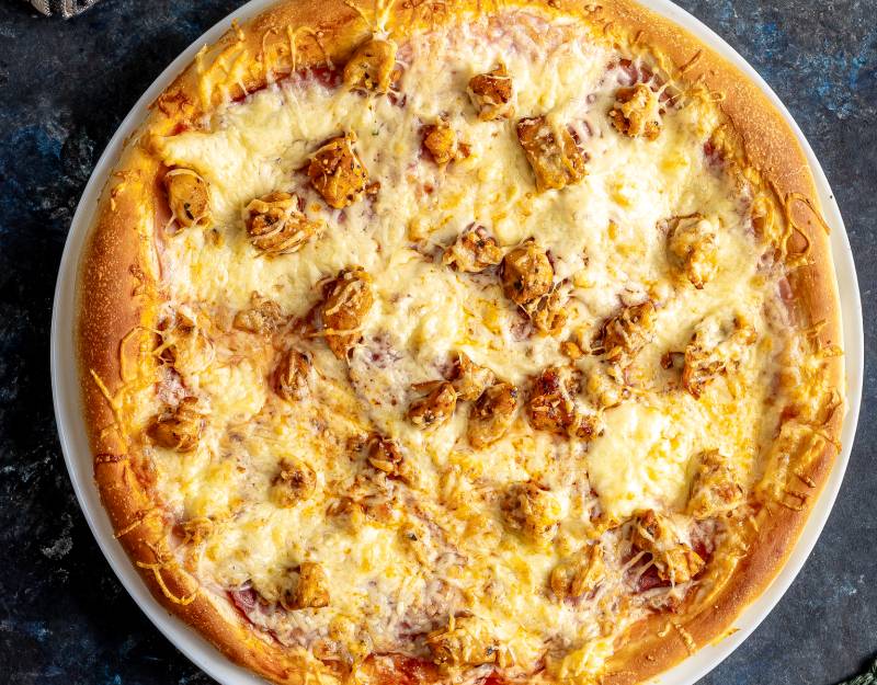 fokhagymás tejfölös alap, Bacon, Csirkemell, Lilahagyma, Sajt